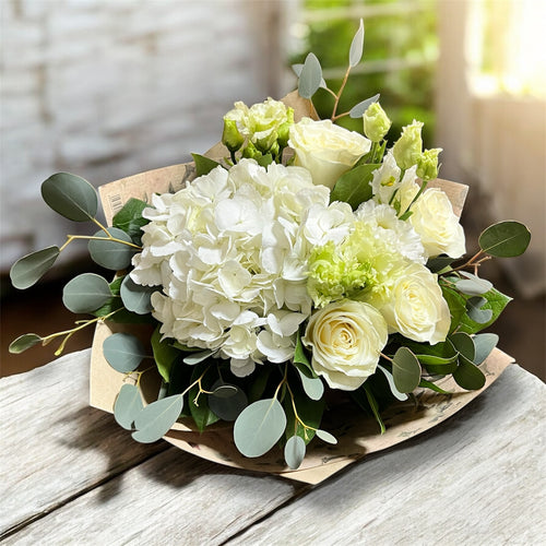 Buchet roz delicat – hortensie și trandafiri