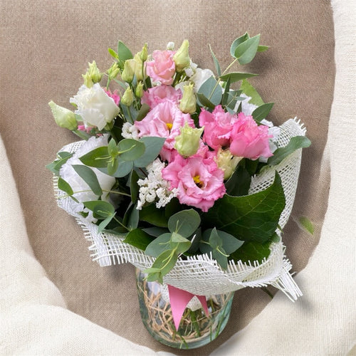 Aranjament cu trandafiri, lisianthus si frezii