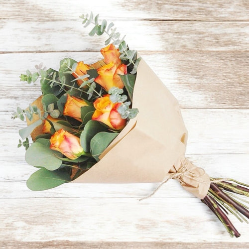 Table arrangement with roses, freesias and wax flowers