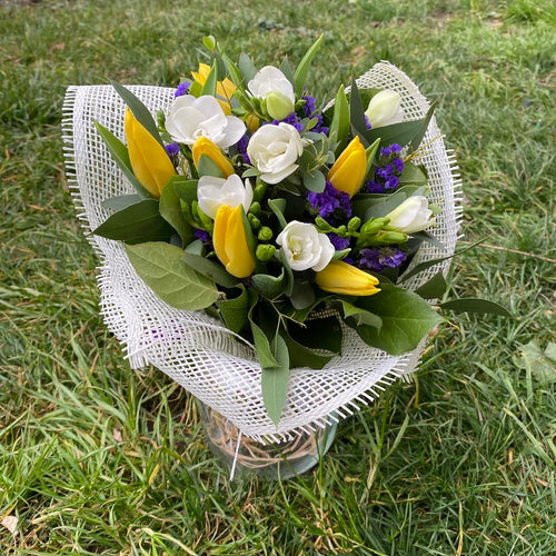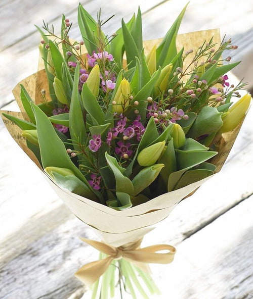 Cheerful spring floral arrangement made with tulips, roses, gerberas, freesias and mini roses, finished with wax flowers and decorative greenery.